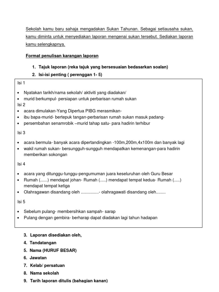 4 praktis topikal bm 012 bhg b via www.slideshare.net. Termasya sukan ini diadakan di padang sekolah bermula pada pukul 8.30 pagi. Temasya sukan ini diadakan di padang sekolah bermula pada pukul 8.30 pagi. Contoh karangan 1 aktiviti sukan merupakan antara isu yang sering diwara warakan dalam media cetak dan media elektronik di negara kita akhir akhir ini. Kegiatan sukan merupakan langkah awal seperti kata pepatah sediakan payung sebelum hujan dalam mengawal obesiti, penyakit kronik seperti darah tinggi, diabetis dan penyakit jantung. Contoh karangan faedah bersukan setiap pelajar diwajibkan menyertai aktiviti sukan di sekolah. Contoh karangan bi tentang hari sukan. Contoh karangan laporan hari sukan. Laporan hari sukan negara sk skarok oktober 2016 via www.slideshare.net. Ia diadakan di padang tan sri noraini ahmad bermula pada pukul 7.45 pagi. For more information and source, see on this link : Catatan hari sukan sekolah jummaat,24 jun 2011 7. Ia diadakan di padang tan sri noraini ahmad bermula pada pukul 745 pagi.